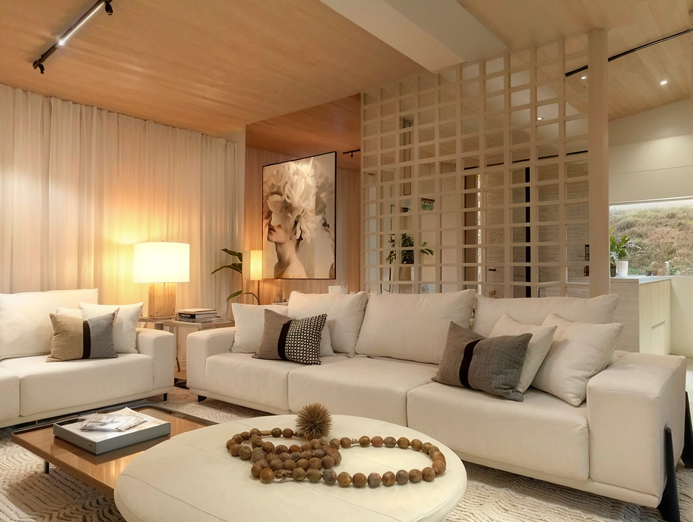 Harmonia/RS - design contemporâneo com toques de aconchego natural, combinando tons neutros, madeira clara e elementos orgânicos. O ambiente valoriza a sensação de conforto, luminosidade e harmonia, com uma paleta de cores suaves — predominância do bege, branco e madeira natural. A proposta cria uma atmosfera elegante e acolhedora, ideal para momentos de relaxamento e convivência.